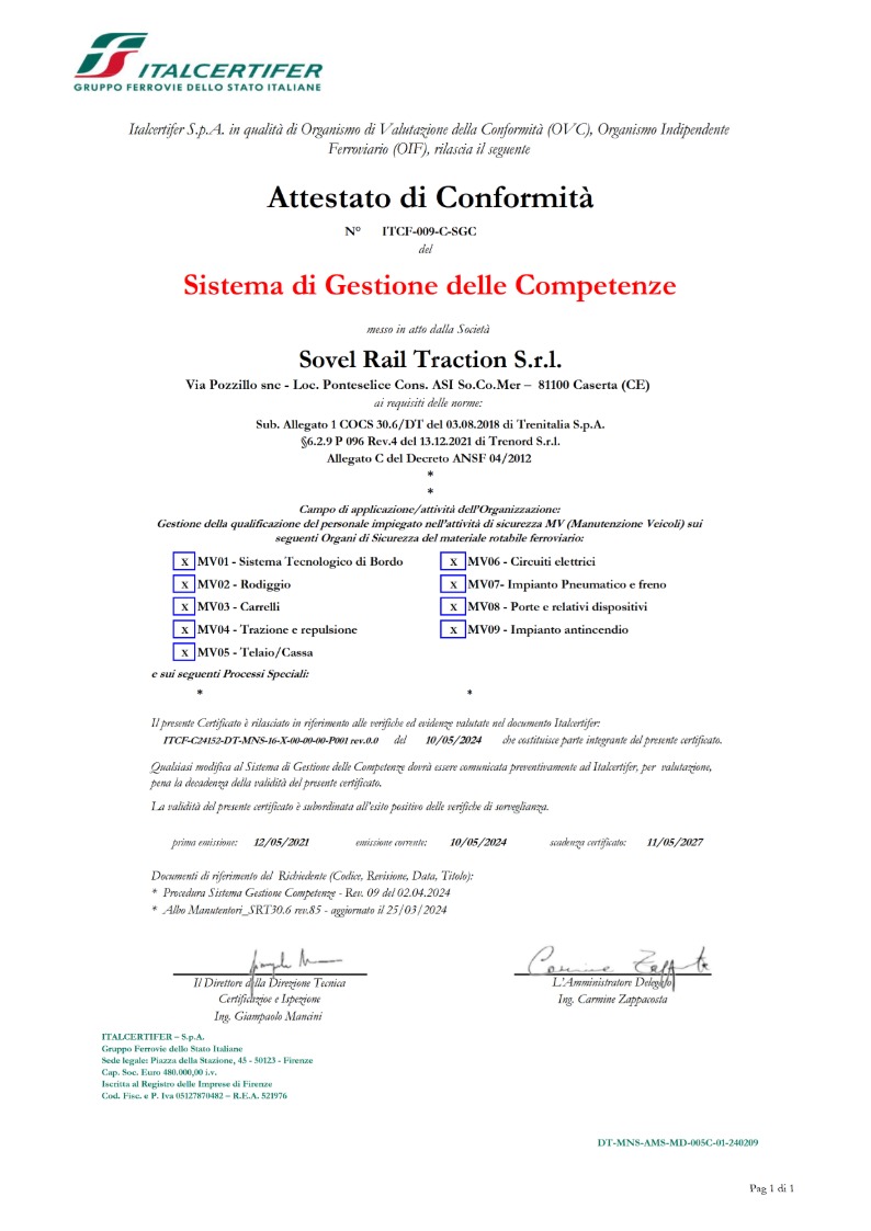 Certificazione del sistema di gestione delle competenze in linea con circolari Trenitalia S.p.A.